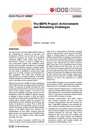 The Base Erosion and Profit Shifting (BEPS) Project of the Organisation for Economic Co-operation and Development (OECD) and the G20 aims to reduce harmful tax avoidance and evasion by multinational enterprises (MNEs), which creates large losses in governments’ revenues. In times of multiple crises, many governments urgently seek additional revenue sources to finance public expenditures for sustainable development. In particular, many low- and lower-middle-income countries have tax-to-GDP ratios of less than 15 per cent, which is insufficient to provide basic public goods such as health, education and infrastructure for their populations. This policy brief evaluates the achievements and remaining challenges of the BEPS Project to mobilise more domestic revenues, in particular in low- and middle-income countries (LMICs).