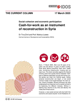 Three months after the fall of Assad, the enormous challenges facing the new leadership are becoming increasingly clear. Bringing peace to the country and reconciliation between population groups requires economic, social and political participation. Cash-for-work can be an important part of the solution, supporting both economic reconstruction and the emergence of a new social contract and, in doing so, generating considerable synergies.
