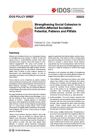 Bilateral and multilateral donors are increasingly focusing on strengthening social cohesion in efforts to build and sustain peace in conflict-affected societies. What does promoting social cohesion mean with respect to international engagement? This policy brief provides an overview of the “social cohesion” approach, explains how it applies to conflict-affected and fragile contexts, and introduces a typology of common interventions. It discusses the added value of taking a social cohesion approach to development and peacebuilding practice, as well as challenges policymakers and practitioners may encounter when using it.