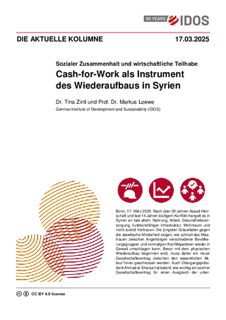 Auch wenn bei Cash-for-Work höhere Kosten durch Planungs- und Materialaufwand anfallen als bei anderen Sozialprogrammen und die Beschäftigungsdauer für die Teilnehmenden oft kurz ist, lohnt sich der Aufwand: Wie der Weltbankbericht Building for Peace betont, ist es beim Wiederaufbau kriegszerstörter Länder gleichermaßen wichtig, das soziale Gefüge und Vertrauen wiederherzustellen – sozusagen die „Software“ des jeweiligen Landes – wie auch die gebaute Infrastruktur, also seine „Hardware“. Deutsche Entwicklungszusammenarbeit hat bereits wertvolle Erfahrungen mit Cash-for-Work in Jordanien, Libanon und in der Türkei gesammelt. Ob in Syrien oder im Gaza-Streifen: Deutschland sollte auf diese Erfahrungen aufbauen und die notwendigen Mittel investieren.
