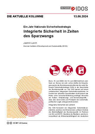 Bonn, 13. Juni 2024. Am 14. Juni 2024 steht ein Jubiläum an. Genau ein Jahr vorher stellte die Ampelregierung bei der Bundespressekonferenz die erste Nationale Sicherheitsstrategie (SiSt) in der Geschichte der Bundesrepublik vor. Die SiSt basiert auf einem umfassenden, integrierten Sicherheitsverständnis. Im Kontext der aktuellen Spardebatten droht jedoch das Risiko einer Versicherheitlichung wichtiger Bereiche der Außen-, Entwicklungs- und Demokratiepolitik, - dass also deren Ziele und Prinzipien der sicherheitspolitischen Logik untergeordnet werden.
