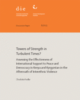 The analysis shows that first, donors had a considerably larger impact on the political process in Kenya than in Kyrgyzstan, second, that these two countries have been particularly struggling with state legitimacy and continue to do so and third, that three factors influenced international actors’ success or failure to effectively promote peace and democracy in the two countries: cooperative vs. coercive forms of support, donor coordination and prioritising stability over democracy.