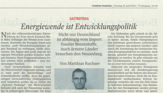 Da auch viele Entwicklungs- und Schwellenländer von fossilen Energieimporten abhängig sind, haben die Erfahrungen, die Deutschland mit der Energiewende macht, internationale Vorbildfunktion. Wenn Deutschland die erfolgreiche Energiewende gelingt und zeigt, dass Wettbewerbsfähigkeit, Beschäftigung und Klimaschutz gleichzeitig zu erreichen sind, wird das Nachahmer finden, auch in vielen Entwicklungs- und Schwellenländern. Die deutsche Energiewende ist deshalb entwicklungspolitisch von großer Bedeutung.