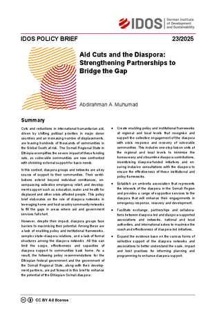 Cuts and reductions in international humanitarian aid, driven by shifting political priorities in major donor countries and an increasing number of displacements, are leaving hundreds of thousands of communities in the Global South at risk. The Somali Regional State in Ethiopia exemplifies the severe impact of these funding cuts, as vulnerable communities are now confronted with shrinking external support for basic needs. In this context, diaspora groups and networks are a key source of support to their communities. Their contributions extend beyond individual remittances, encompassing collective emergency relief, and development support such as education, water and health for displaced and other crisis-affected people. This policy brief elaborates on the role of diaspora networks in leveraging home and host country community networks to fill the gaps in areas where aid and government services fall short. However, despite their impact, diaspora groups face barriers to maximising their potential. Among these are a lack of enabling policy and institutional frameworks, complex state–diaspora relations, and a lack of formal structures among the diaspora networks. All this can limit the scope, effectiveness and capacities of diaspora support to communities back home. As a result, the following policy recommendations for the Ethiopian federal government and the government of the Somali Regional State, along with their development partners, are put forward in this brief to enhance the potential of the Ethiopian-Somali diaspora: