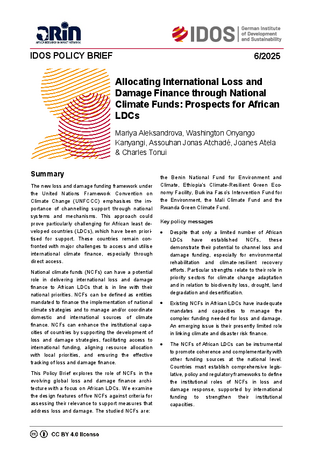 The new loss and damage funding framework under the United Nations Framework Convention on Climate Change (UNFCCC) emphasises the importance of channelling support through national systems and mechanisms. This approach could prove particularly challenging for African least developed ountries (LDCs), which have been prioritised for support. These countries remain confronted with major challenges to access and utilise international climate finance, especially through direct access. National climate funds (NCFs) can have a potential role in delivering international loss and damage finance to African LDCs that is in line with their national priorities. NCFs can be defined as entities mandated to finance the implementation of national climate strategies and to manage and/or coordinate domestic and international sources of climate finance. NCFs can enhance the institutional capacities of countries by supporting the development of loss and damage strategies, facilitating access to international funding, aligning resource allocation with local priorities, and ensuring the effective tracking of loss and damage finance. This Policy Brief explores the role of NCFs in the evolving global loss and damage finance architecture with a focus on African LDCs. We examine the design features of five NCFs against criteria for assessing their relevance to support measures that address loss and damage. The studied NCFs are: the Benin National Fund for Environment and Climate, Ethiopia’s Climate-Resilient Green Economy Facility, Burkina Faso’s Intervention Fund for the Environment, the Mali Climate Fund and the Rwanda Green Climate Fund. Key policy messages