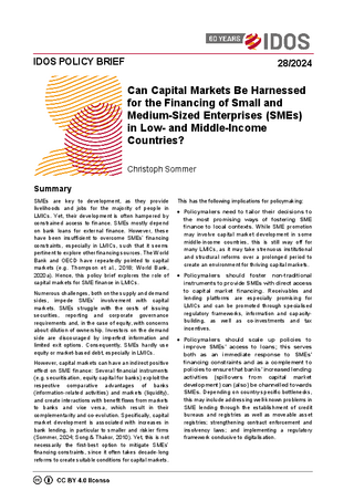 SMEs are key to development, as they provide livelihoods and jobs for the majority of people in LMICs. Yet, their development is often hampered by constrained access to finance. SMEs mostly depend on bank loans for external finance. However, these have been insufficient to overcome SMEs’ financing constraints, especially in LMICs, such that it seems pertinent to explore other financing sources. The World Bank and OECD have repeatedly pointed to capital markets (e.g. Thompson et al., 2018; World Bank, 2020a). Hence, this policy brief explores the role of capital markets for SME finance in LMICs. Numerous challenges, both on the supply and demand sides, impede SMEs’ involvement with capital markets. SMEs struggle with the costs of issuing securities, reporting and corporate governance requirements and, in the case of equity, with concerns about dilution of ownership. Investors on the demand side are discouraged by imperfect information and limited exit options. Consequently, SMEs hardly use equity or market-based debt, especially in LMICs. However, capital markets can have an indirect positive effect on SME finance: Several financial instruments (e.g. securitisation, equity capital for banks) exploit the respective comparative advantages of banks (information-related activities) and markets (liquidity), and create interactions with benefit flows from markets to banks and vice versa, which result in their complementarity and co-evolution. Specifically, capital market development is associated with increases in bank lending, in particular to smaller and riskier firms (Sommer, 2024; Song & Thakor, 2010). Yet, this is not necessarily the first-best option to mitigate SMEs’ financing constraints, since it often takes decade-long reforms to create suitable conditions for capital markets. This has the following implications for policymaking: