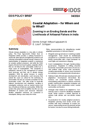 Climate change adaptation is a key pillar in climate policy. The Paris Agreement’s Global Goal on Adaptation (GGA) provides a unifying framework to accelerate action towards strengthening resilience and reducing vulnerability to climate change. However, the implementation of adaptation projects is constrained by complex political processes, and while the GGA targets all levels from local to global, adaptation efforts that are not linked to the vulnerability context are a major cause of maladaptation. This complexity is particularly relevant to the management of coastal sand resources and their role in climate change adaptation. With the global increase in coastal development and urbanisation, sand resources that protect the coast are critical for the well-being of communities but also for concrete production for the construction sector. This often leads to trade-offs between development and adaptation, resulting in maladaptive outcomes such as coastal erosion and loss of livelihood of fisheries communities. Within this context, this policy brief exemplifies how the use and distribution of coastal sand resources determine whether adaptation outcomes are successful or maladaptive, taking a case study from India.