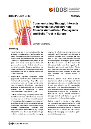 • That is why the way European donors talk about humanitarian aid matters as much as how they provide it. My experimental research in Turkey shows that transparent communication about the realpolitik behind humanitarian aid may help counter authoritarian propaganda in highly polarised middle-income countries with widespread anti-Western attitudes. My findings indicate that when donors openly acknowledge strategic motivations, propaganda messaging