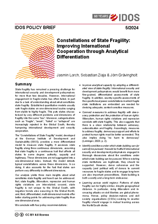 State fragility has remained a pressing challenge for international security and development policymakers for more than two decades. However, international engagement in fragile states has often failed, in part due to a lack of understanding about what constitutes state fragility. Established quantitative models usually rank fragile states on one-dimensional scales ranging from stable to highly fragile. This puts states characterised by very different problems and dimensions of fragility into the same “box”. Moreover, categorisations such as “fragile”, “weak”, “failed” or “collapsed” are increasingly rejected in the Global South, thereby hampering international development and security cooperation. The “Constellations of State Fragility” model, developed at the German Institute of Development and Sustainability (IDOS), provides a more differentiated model to measure state fragility. It assesses state fragility along three continuous dimensions, assuming that state fragility is a continuous trait that affects all states to some degree: authority, capacity and legitimacy. These dimensions are not aggregated into a one-dimensional index. Instead, the model detects typical constellations across these dimensions. In so doing, it also accounts for the fact that states can perform very differently in different dimensions. Our analysis yields three main insights about what constitutes state fragility and how it can be addressed: first, state fragility, illiberalism, repression and human rights violations are interrelated; second, state fragility is not unique to the Global South, with negative trends also occurring in the Global North; and, third, differentiated, multi-dimensional models offer better starting points for addressing state fragility than one-dimensional ones. We conclude with four policy recommendations: