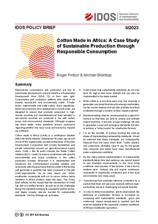 Cotton made in Africa (CmiA) is a certification initiative within the textile industry. Established 18 years ago as part of one of the largest public-private partnerships of German Development Cooperation with private foundations and private companies around an agriculture-based supply chain, CmiA – like its sister scheme the Better Cotton Initiative (BCI) – seeks to ensure compliance with specific environmental and social conditions in the cotton production process. Wherever it is implemented and monitored, the CmiA-standard provides retailers and consumers with the assurance that the cotton in the textiles and garments in question has been produced in line with CmiA-requirements. Up to now, about one million smallholder households with six to seven million family members in Africa produce under the label. This Policy Brief reflects on the impact that the introduction of CmiA has had on certified farmers, as well as on the challenges facing this standard following its successful market launch, and draws broader lessons learned for sustainability standards. The key findings are as follows: