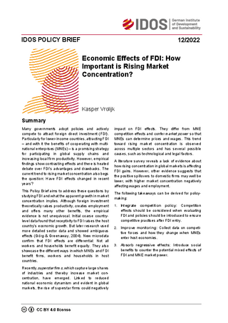 Many governments adopt policies and actively compete to attract foreign direct investment (FDI). Particularly for lower-income countries, attracting FDI – and with it the benefits of cooperating with multi-national enterprises (MNEs) – is a promising strategy for participating in global supply chains and increasing local firm productivity. However, empirical findings show contrasting effects and there is heated debate over FDI’s advantages and drawbacks. The current trend to rising market concentration also begs the question: Have FDI effects changed in recent years?