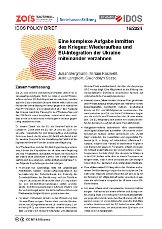 Zu diesem Zweck hat die EU die Ukraine-Fazilität beschlossen. Damit stellt die EU der Ukraine bis 2027 verlässliche Finanzmittel für den Wiederaufbau und wichtige Reformen bereit, die für einen EU-Beitritt erforderlich sind. Der zentrale Fahrplan für die Umsetzung der Fazilität ist der sogenannte Ukraine-Plan der ukrainischen Regierung. Den Wiederaufbau und den EU-Beitritt gleichzeitig zu stemmen, könnte die Kapazitäten der ukrainischen Regierung und des Privatsektors überlasten, wodurch der Rückhalt in der Gesellschaft schwinden könnte. Um beide Prozesse bestmöglich zu verzahnen, sollten Entscheidungsträger*innen folgende Empfehlungen berücksichtigen: