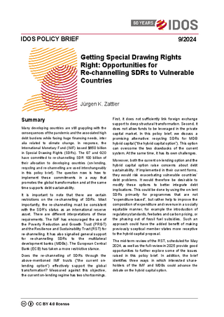 Many developing countries are still grappling with the consequences of the pandemic and the associated high debt burdens while facing huge financing needs, inter alia related to climate change. In response, the International Monetary Fund (IMF) issued $650 billion in Special Drawing Rights (SDRs). The G7 and G20 have committed to re-channelling SDR 100 billion of their allocation to developing countries (on-lending, recycling and re-channelling are used interchangeably in this policy brief). The question now is how to implement these commitments in a way that promotes the global transformation and at the same time supports debt sustainability. It is important to note that there are certain restrictions on the re-channelling of SDRs. Most importantly, the re-channelling must be consistent with the SDR’s status as an international reserve asset. There are different interpretations of these requirements. The IMF has encouraged the use of the Poverty Reduction and Growth Trust (PRGT) and the Resilience and Sustainability Trust (RST) for re-channelling. It has also signalled general support for re-channelling SDRs to the multilateral development banks (MDBs). The European Central Bank (ECB) has taken a more restrictive stance. Does the re-channelling of SDRs through the above-mentioned IMF trusts (“the current on-lending option”) effectively support the global transformation? Measured against this objective, the current on-lending regime has two shortcomings. First, it does not sufficiently link foreign exchange support to deep structural transformation. Second, it does not allow funds to be leveraged in the private capital market. In this policy brief, we discuss a promising alternative: recycling SDRs for MDB hybrid capital (“the hybrid capital option”). This option can overcome the two drawbacks of the current system. At the same time, it has its own challenges. Moreover, both the current on-lending option and the hybrid capital option raise concerns about debt sustainability. If implemented in their current forms, they would risk exacerbating vulnerable countries’ debt problems. It would therefore be desirable to modify these options to better integrate debt implications. This could be done by using the on-lent SDRs primarily for programmes that are not “expenditure-based”, but rather help to improve the composition of expenditure and revenue in a socially equitable manner, for example the introduction of regulatory standards, feebates and carbon pricing, or the phasing out of fossil fuel subsidies. Such an approach could have the added benefit of making previously sceptical member states more receptive to the hybrid capital proposal.