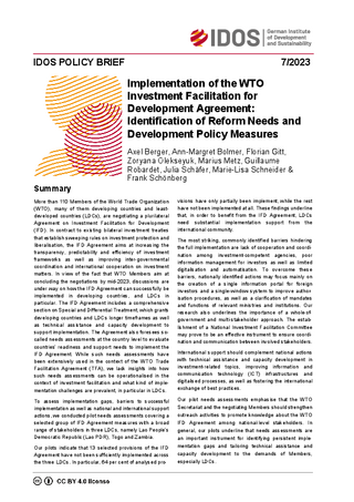 More than 110 Members of the World Trade Organization (WTO), many of them developing countries and least-developed countries (LDCs), are negotiating a plurilateral Agreement on Investment Facilitation for Development (IFD). In contract to existing bilateral investment treaties that establish sweeping rules on investment protection and liberalisation, the IFD Agreement aims at increasing the transparency, predictability and efficiency of investment frameworks as well as improving inter-governmental coordination and international cooperation on investment matters. In view of the fact that WTO Members aim at concluding the negotiations by mid-2023, discussions are under way on how the IFD Agreement can successfully be implemented in developing countries, and LDCs in particular. The IFD Agreement includes a comprehensive section on Special and Differential Treatment, which grants developing countries and LDCs longer timeframes as well as technical assistance and capacity development to support implementation. The Agreement also foresees so-called needs assessments at the country level to evaluate countries’ readiness and support needs to implement the IFD Agreement. While such needs assessments have been extensively used in the context of the WTO Trade Facilitation Agreement (TFA), we lack insights into how such needs assessments can be operationalised in the context of investment facilitation and what kind of imple¬mentation challenges are prevalent, in particular in LDCs.