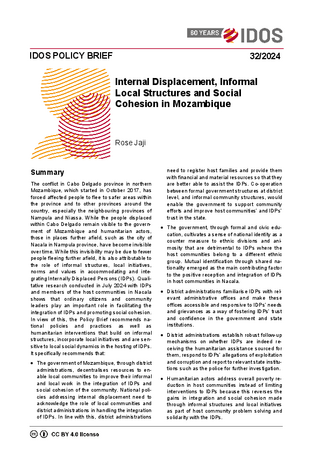 The conflict in Cabo Delgado province in northern Mozambique, which started in October 2017, has forced affected people to flee to safer areas within the province and to other provinces around the country, especially the neighbouring provinces of Nampula and Niassa. While the people displaced within Cabo Delgado remain visible to the government of Mozambique and humanitarian actors, those in places further afield, such as the city of Nacala in Nampula province, have become invisible over time. While this invisibility may be due to fewer people fleeing further afield, it is also attributable to the role of informal structures, local initiatives, norms and values in accommodating and integrating Internally Displaced Persons (IDPs). Qualitative research conducted in July 2024 with IDPs and members of the host communities in Nacala shows that ordinary citizens and community leaders play an important role in facilitating the integration of IDPs and promoting social cohesion. In view of this, the Policy Brief recommends national policies and practices as well as humanitarian interventions that build on informal structures, incorporate local initiatives and are sensitive to local social dynamics in the hosting of IDPs. It specifically recommends that: