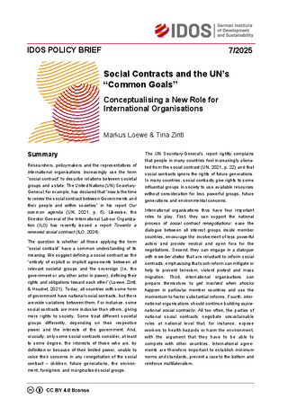 The question is whether all those applying the term “social contract” have a common understanding of its meaning. We suggest defining a social contract as the “entirety of explicit or implicit agreements between all relevant societal groups and the sovereign (i.e. the government or any other actor in power), defining their rights and obligations toward each other” (Loewe, Zintl, & Houdret, 2021). Today, all countries with some form of government have national social contracts, but there are wide variations between them. For instance, some social contracts are more inclusive than others, giving more rights to society. Some treat different societal groups differently, depending on their respective power and the interests of the government. And, crucially, only some social contracts consider, at least to some degree, the interests of those who are, by definition or because of their limited power, unable to voice their concerns in any renegotiation of the social contract – children, future generations, the environment, foreigners and marginalised social groups. The UN Secretary-General’s report rightly complains that people in many countries feel increasingly alienated from the social contract (UN, 2021, p. 22) and that social contracts ignore the rights of future generations. In many countries, social contracts give rights to some influential groups in society to use available resources without consideration for less powerful groups, future generations and environmental concerns. International organisations thus have four important roles to play. First, they can support the national process of social contract renegotiations: ease the dialogue between all interest groups inside member countries, encourage the involvement of less powerful actors and provide neutral and open fora for the negotiations. Second, they can engage in a dialogue with member states that are reluctant to reform social contracts, emphasising that such reform can mitigate or help to prevent terrorism, violent protest and mass migration. Third, international organisations can prepare themselves to get involved when shocks happen in particular member countries and use the momentum to foster substantial reforms. Fourth, international organisations should continue building supra-national social contracts. All too often, the parties of national social contracts negotiate unsustainable rules at national level that, for instance, expose workers to health hazards or harm the environment, with the argument that they have to be able to compete with other countries. International agreements are therefore important to establish minimum norms and standards, prevent a race to the bottom and reinforce multilateralism.