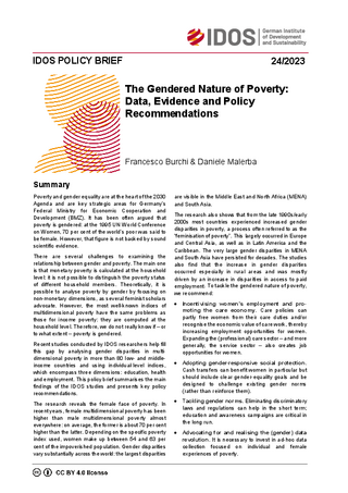 Poverty and gender equality are at the heart of the 2030 Agenda and are key strategic areas for Germany’s Federal Ministry for Economic Cooperation and Development (BMZ). It has been often argued that poverty is gendered: at the 1995 UN World Conference on Women, 70 per cent of the world’s poor was said to be female. However, that figure is not backed by sound scientific evidence. There are several challenges to examining the relationship between gender and poverty. The main one is that monetary poverty is calculated at the household level: it is not possible to distinguish the poverty status of different household members. Theoretically, it is possible to analyse poverty by gender by focusing on non-monetary dimensions, as several feminist scholars advocate. However, the most well-known indices of multidimensional poverty have the same problems as those for income poverty: they are computed at the household level. Therefore, we do not really know if – or to what extent – poverty is gendered. Recent studies conducted by IDOS researchers help fill this gap by analysing gender disparities in multidimensional poverty in more than 80 low- and middle-income countries and using individual-level indices, which encompass three dimensions: education, health and employment. This policy brief summarises the main findings of the IDOS studies and presents key policy recommendations. The research reveals the female face of poverty. In recent years, female multidimensional poverty has been higher than male multidimensional poverty almost everywhere: on average, the former is about 70 per cent higher than the latter. Depending on the specific poverty index used, women make up between 54 and 63 per cent of the impoverished population. Gender disparities vary substantially across the world: the largest disparities are visible in the Middle East and North Africa (MENA) and South Asia. The research also shows that from the late 1990s/early 2000s most countries experienced increased gender disparities in poverty, a process often referred to as the “feminisation of poverty”. This largely occurred in Europe and Central Asia, as well as in Latin America and the Caribbean. The very large gender disparities in MENA and South Asia have persisted for decades. The studies also find that the increase in gender disparities occurred especially in rural areas and was mostly driven by an increase in disparities in access to paid employment. To tackle the gendered nature of poverty, we recommend: