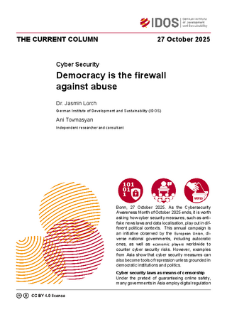 Bonn, 27 October 2025. As the Cybersecurity Awareness Month of October 2025 ends, it is worth asking how cyber security measures, such as anti-fake news laws and data localisation, play out in different political contexts. This annual campaign is an initiative observed by the European Union, diverse national governments, including autocratic ones, as well as economic players worldwide to counter cyber security risks. However, examples from Asia show that cyber security measures can also become tools of repression unless grounded in democratic institutions and politics.