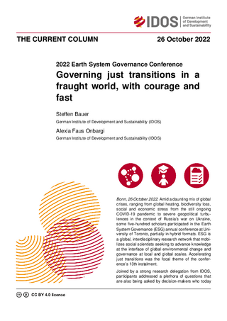 Bonn, 26 October 2022. Amid a daunting mix of global crises, ranging from global heating, biodiversity loss, social and economic stress from the still ongoing COVID-19 pandemic to severe geopolitical turbulences in the context of Russia’s war on Ukraine, some five-hundred scholars participated in the Earth System Governance (ESG) annual conference at University of Toronto, partially in hybrid formats. ESG is a global, interdisciplinary research network that mobilizes social scientists seeking to advance knowledge at the interface of global environmental change and governance at local and global scales. Accelerating just transitions was the focal theme of the conference’s 13th instalment.