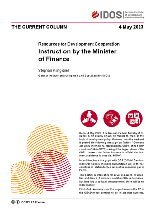 Bonn, 4 May 2023. The German Federal Ministry of Finance is not exactly known for making its mark on the topic of development policy. However, over the weekend it posted the following message on Twitter: "Germany assumes international responsibility. 0.83% of its #GDP spent on ODA in 2022, making it the largest donor of the #G7. However, no further increase in official development assistance is possible. #ODA".