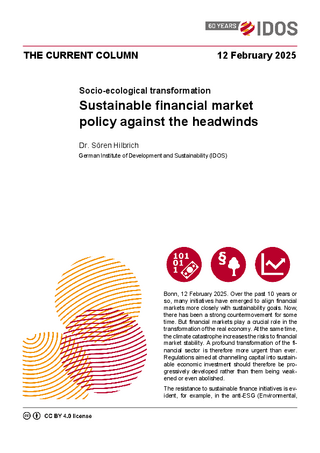 Bonn, 12 February 2025. Over the past 10 years or so, many initiatives have emerged to align financial markets more closely with sustainability goals. Now, there has been a strong countermovement for some time. But financial markets play a crucial role in the transformation of the real economy. At the same time, the climate catastrophe increases the risks to financial market stability. A profound transformation of the financial sector is therefore more urgent than ever. Regulations aimed at channelling capital into sustainable economic investment should therefore be progressively developed rather than them being weakened or even abolished.