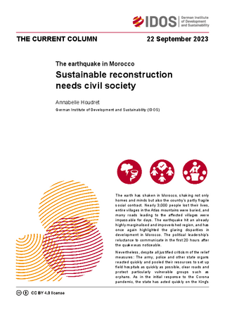 The legitimacy of the government in reconstruction will not only depend on whether it can protect people in the remote, neglected areas in the sense of the social contract and provide access to public infrastructure. Rather, it is precisely the social contract’s third pillar, participation, that holds a lot of potential: more space for the know-how, dynamism and solidarity of (civil) society in reconstruction and in the country's political decision-making processes can enable a more inclusive and sustainable social contract. And Germany's and Europe's cooperation with Morocco can support this by not only mobilising funds for infrastructure development, but also by strengthening governance capacities and involving and promoting civil society.