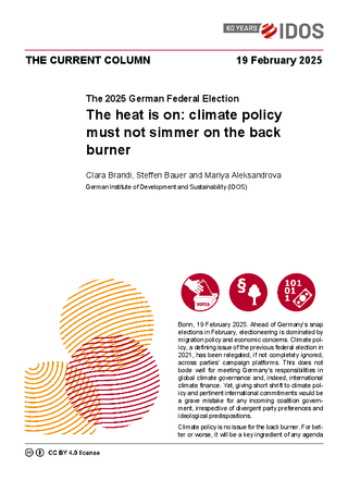 Bonn, 19 February 2025. Ahead of Germany’s snap elections in February, electioneering is dominated by migration policy and economic concerns. Climate policy, a defining issue of the previous federal election in 2021, has been relegated, if not completely ignored, across parties’ campaign platforms. This does not bode well for meeting Germany’s responsibilities in global climate governance and, indeed, international climate finance. Yet, giving short shrift to climate policy and pertinent international commitments would be a grave mistake for any incoming coalition government, irrespective of divergent party preferences and ideological predispositions.