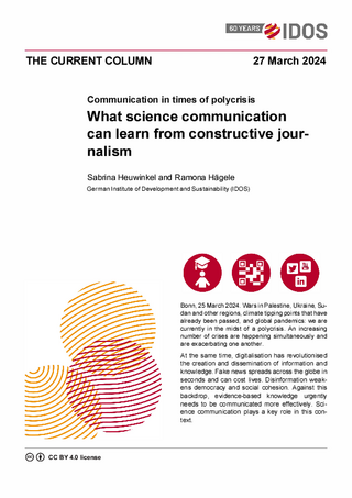 Science communication reflects what the scientific community is producing and integrates it into social discourse. The idea behind constructive journalism is not only to describe a problem but also to look at what happens next. The Bonn Institute describes constructive journalism on the basis of three elements: a pronounced focus on solutions; multiple perspectives, including diversity and structural aspects; and a constructive dialogue, in which journalists also act as moderators, advocating exchange and understanding.