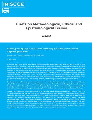 Research with and about vulnerable populations, including refugees and migrants, raises several methodological concerns. Due to their experiences, potential respondents might mistrust the motives and independence of researchers and how the information they share might be used. The necessity felt to keep a low profile leads to challenges for researchers to access relevant population groups and difficulties in establishing trust to share information. This article gives examples from across the globe, including Jordan, Turkey and Kenya, on how quantitative researchers try to access these populations and what approaches are used to establish trust, including the involvement of local ‘gatekeepers’, non-governmental organizations, community leaders, and the employment of refugee enumerators. Furthermore, conducting quantitative panel surveys with refugee populations that feature a high rate of mobility comes with another set of challenges for researchers. These challenges often evolve around finding the right balance between personal data collection and the protection of personal data. This article illustrates these challenges with examples of panel surveys conducted in Jordan and Turkey.Another big challenge is the establishment of a representative population sample. Due to a variety of reasons, including that the precise size and distribution of the migrant and refugee population is usually unknown, this has been difficult for researchers. These populations are often settled informally and not included in national surveys and largely not captured in official registries. There are large heterogeneities within these populations and some groups can be described as being rare or hidden systematically. As a result, self-selection is a prominent bias in migrant and refugee samples. This brief sheds light on random sampling strategies that have been used by quantitative researchers to improve the representativeness of the population sample, including innovative mapping strategies using google maps. Also, it discusses the use of social media to reach migrant populations.