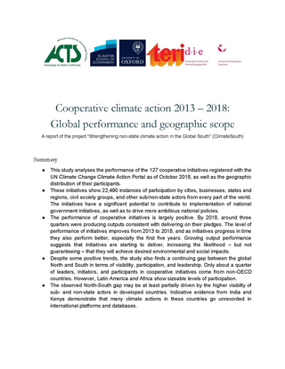 This study analyses the performance of the 127 cooperative initiatives registered with the UN Climate Change Climate Action Portal as of October 2018, as well as the geographic distribution of their participants.These initiatives show 22,490 instances of participation by cities, businesses, states and regions, civil society groups, and other sub/non-state actors from every part of the world. The initiatives have a significant potential to contribute to implementation of national government initiatives, as well as to drive more ambitious national policies.