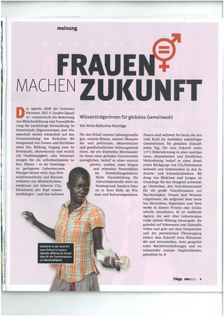 Für den Erhalt unserer Lebensgrundlagen, unseres Klimas, unserer Ökosysteme und politischer, ökonomischer und gesellschaftlicher Ordnungsstrukturen, die ein friedvolles Miteinander im Sinne eines globalen Gemeinwohls ermöglichen, bedarf es eines emanzipierten, starken, eines klugen und sehenden Frauenbildes im Entwicklungsdiskurs.