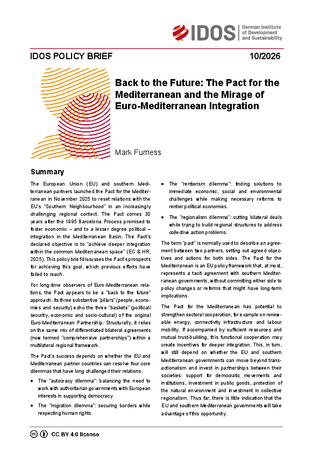 The European Union (EU) and southern Medi-terranean partners launched the Pact for the Mediter-ranean in November 2025 to reset relations with the EU’s “Southern Neighbourhood” in an increasingly challenging regional context. The Pact comes 30 years after the 1995 Barcelona Process promised to foster economic – and to a lesser degree political – integration in the Mediterranean Basin. The Pact’s declared objective is to “achieve deeper integration within the common Mediterranean space” (EC & HR, 2025). This policy brief discusses the Pact’s prospects for achieving this goal, which previous efforts have failed to reach. For long-time observers of Euro-Mediterranean rela-tions, the Pact appears to be a “back to the future” approach. Its three substantive “pillars” (people, econo-mies and security) echo the three “baskets” (political/ security, economic and socio-cultural) of the original Euro-Mediterranean Partnership. Structurally, it relies on the same mix of differentiated bilateral agreements (now termed “comprehensive partnerships”) within a multilateral regional framework. The Pact’s success depends on whether the EU and Mediterranean partner countries can resolve four core dilemmas that have long challenged their relations: