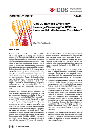 This Policy Brief examines whether guarantees can serve as an effective leveraging mechanism for small and medium-sized enterprises (SMEs) in low- and middle-income countries (LMICs). This is especially so because SMEs remain largely hampered by poor access to finance, despite their key role in providing jobs for the local population and contributing to economic growth. Moreover, in the face of climate change, SME adaptation requires new investments in climate-resistant technologies and clean energies, highlighting the need for additional financing amid severe constraints on access to capital. Guarantees can complement other leveraging mechanisms, further easing financing constraints for SMEs in LMICs. Guarantees can absorb some of the risks associated with investment, offering financial institutions greater security.