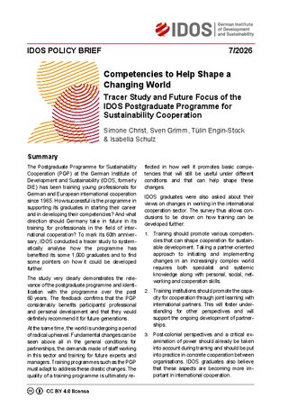 The Postgraduate Programme for Sustainability Cooperation (PGP) at the German Institute of Development and Sustainability (IDOS, formerly DIE) has been training young professionals for German and European international cooperation since 1965. How successful is the programme in supporting its graduates in starting their career and in developing their competencies? And what direction should Germany take in future in its training for professionals in the field of international cooperation? To mark its 60th anniversary, IDOS conducted a tracer study to systematically analyse how the programme has benefited its some 1,000 graduates and to find some pointers on how it could be developed further.