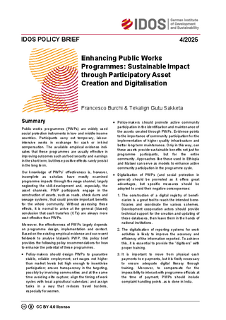 Moreover, the effectiveness of PWPs largely depends on programme design, implementation and context. Based on the existing empirical evidence and our recent fieldwork to analyse Malawi’s PWP, this policy brief provides the following policy recommendations for how to enhance the potential of these programmes.
