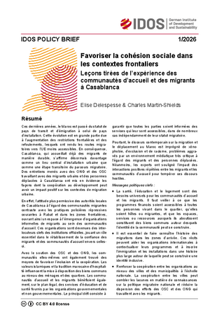 Ces dernières années, le Maroc est passé du statut de pays de transit et d’émigration à celui de pays d’installation. Cette évolution est en grande partie due à l’augmentation des restrictions frontalières et des refoulements, lesquels ont rendu les routes migratoires vers l’UE moins accessibles. En conséquence, Casablanca, qui accueillait déjà des migrants de manière durable, s’affirme désormais davantage comme un lieu central d’installation urbaine que comme une étape transitoire du parcours migratoire. Des entretiens menés avec des ONG et des OSC travaillant avec des migrants urbains et des personnes déplacées à Casablanca ont mis en évidence les façons dont la coopération au développement peut avoir un impact positif sur les contextes de migration urbaine. En effet, l’attitude plus permissive des autorités locales de Casablanca à l’égard des communautés migrantes contraste avec les pratiques policières répressives courantes à Rabat et dans les zones frontalières, ouvrant ainsi un espace à l’émergence d’organisations informelles de migrants au sein des communautés d’accueil. Ces organisations sont devenues des interlocuteurs clefs des institutions officielles, jouant un rôle essentiel dans le rétablissement de la confiance des migrants et des communautés d’accueil envers celles-ci. Avec le soutien des OSC et des ONG, les communautés elles-mêmes ont également trouvé des moyens de favoriser l’inclusion et la coopération. Les valeurs islamiques et la tradition marocaine d’hospitalité influencent la mise à disposition des biens communs au niveau des ménages et des quartiers. Les communautés d’accueil et les migrants bénéficient également, sur le plan légal, des services d’éducation et de santé fournis par les organisations gouvernementales et non gouvernementales. Le principal défi consiste àgarantir que toutes les parties soient informées des services qui leur sont accessibles, dans de nombreux cas indépendamment de leur statut migratoire. Pourtant, le discours contemporain sur la migration et le déplacement au Maroc est imprégné de xénophobie, d’exclusion et de racisme, problèmes aggravés par un environnement médiatique très critique à l’égard des migrants et des personnes déplacées. Néanmoins, les experts ont souligné l’impact des interactions positives répétées entre les migrants et les communautés d’accueil pour tempérer ces discours hostiles.