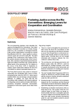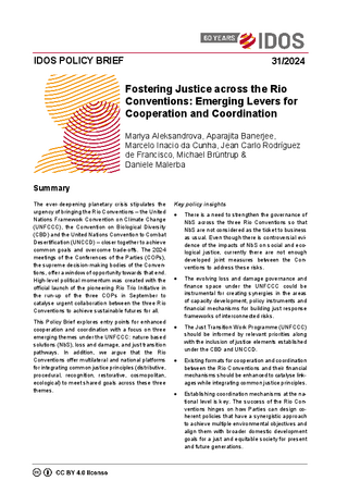 This Policy Brief explores entry points for enhanced cooperation and coordination with a focus on three emerging themes under the UNFCCC: nature-based solutions (NbS), loss and damage, and just transition pathways. In addition, we argue that the Rio Conventions offer multilateral and national platforms for integrating common justice principles (distributive, procedural, recognition, restorative, cosmopolitan, ecological) to meet shared goals across these three themes.