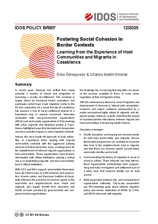 In recent years, Morocco has shifted from being primarily a country of transit and emigration to becoming a country of settlement. This evolution is largely driven by increased border restrictions and pushbacks, which have made migration routes to the EU less accessible. As a result, the city of Casablanca has become a hub of urban settlement instead of a transitional step in onward movement. Interviews conducted with non-governmental organisations (NGOs) and civil society organisations (CSOs) working with urban migrants and displaced people in Casablanca highlighted ways that development cooperation can have a positive impact on urban migration contexts.