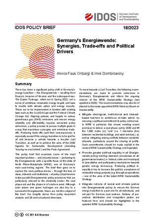 There has been a significant policy shift in Germany’s energy transition – the Energiewende – resulting from Russia’s invasion of Ukraine and the subsequent war. The Easter Package, rolled out in Spring 2022, set a series of ambitious renewable energy targets and laws to enable both climate action and energy security. These are to be implemented in tandem with existing laws such as the Coal Exit Law and the Federal Climate Change Act. Aligning policies and targets to reduce greenhouse gas (GHG) emissions and ensure energy reliability and affordability requires concerted policy coherence, a policy process to pursue multiple goals in a way that maximises synergies and minimises trade-offs. Reducing trade-offs (and their consequences) is especially crucial if the energy transition is to be just for all and become a vehicle towards a broader Just Transition, as well as to achieve the aims of the 2030 Agenda for Sustainable Development (including “leaving no one behind”) and the Paris Agreement. This policy brief first examines some of the most important policies – and (in)coherences – pertaining to the Energiewende, with a specific focus on the state of North Rhine-Westphalia (NRW), one of Germany’s main coal-mining regions. The brief then goes on to explore the main political drivers – through the lens of ideas, interests and institutions – of policy (in)coherence in two parallel Energiewende policy processes that are particularly relevant to the electricity sector: the coal phase-out and the phase-in of onshore wind. Although solar power and green hydrogen are also key to a successful Energiewende, these are not the subject of this brief. Our insights derive from policy document analysis and 28 semi-structured interviews. To move towards a Just Transition, the following recommendations are made to promote coherence in Germany’s Energiewende and inform the ongoing revision of the NRW Sustainability Strategy (last updated in 2020). The recommendations may also be of interest to the newly appointed NRW Advisory Board on Sustainability: