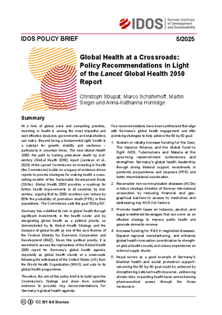 At a time of global crisis and competing priorities, investing in health is among the most impactful and cost-effective decisions governments and stakeholders can make. Beyond being a fundamental right, health is a catalyst for growth, stability and resilience – particularly in uncertain times. The new Global Health 2050: the path to halving premature death by mid-century (Global Health 2050) report (Jamison et al., 2024) of the Lancet Commission on Investing in Health (the Commission) builds on a legacy of evidence-driven reports to provide strategies for making health a cross-cutting enabler of the Sustainable Development Goals (SDGs). Global Health 2050 provides a roadmap for further health improvements in all countries by mid-century, arguing that by 2050 countries can reduce by 50% the probability of premature death (PPD) in their populations. The Commission calls this goal “50 by 50”. Germany has solidified its role in global health through significant investments in the health sector and by designating global health as a political priority, as demonstrated by its Global Health Strategy and the inclusion of global health as one of the core themes of the Federal Ministry for Economic Cooperation and Development (BMZ). Given this political priority, it is essential to assess the implications of the Global Health 2050 report for Germany’s global health agenda, especially as global health stands at a crossroads following the withdrawal of the United States (US) from the World Health Organization (WHO) and cuts to its global health programmes. Therefore, the aim of this policy brief is to build upon the Commission’s findings and draw from scientific evidence to provide key recommendations for Germany’s global health agenda. Five recommendations have been synthesised that align with Germany’s global health engagement and offer promising strategies to help achieve the 50 by 50 goal: