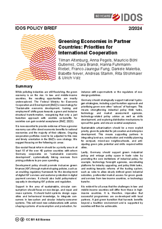 While polluting industries are still flourishing, the green economy is on the rise. In low- and middle-income countries, the resulting opportunities are mostly underexplored. The Federal Ministry for Economic Cooperation and Development (BMZ)’s new strategy for “Sustainable economic development, training and employment” shifts gears towards a green and inclusive structural transformation, recognising that only a just transition approach with credible co-benefits for societies can gain societal acceptance (BMZ, 2023). It is now essential to provide evidence of how a greener economy can offer direct economic benefits to national economies and the majority of their citizens. Ongoing cooperation portfolios need to be adjusted to this new and timely orientation in the BMZ’s core strategy. We suggest focusing on the following six areas: Eco-social fiscal reform should be a priority area in at least 15 of the over 40 partner countries with whom Germany cooperates on “sustainable economic development”, systematically linking revenues from pricing pollutions to pro-poor spending. Development policy should promote inclusive green finance (IGF) through market-shaping policies, such as an enabling regulatory framework for the development of digital IGF services and customer protection in digital payment services. It should also build policymakers’ capacity in developing IGF policies and regulation. Support in the area of sustainable, circular con-sumption should focus on eco-design, and repair and reuse systems. It should build systems design capa-cities and behavioural knowledge, to integrate con-sumers in low-carbon and circular industry-consumer systems. This will need new collaborations with actors shaping systems of consumption and production, for instance with supermarkets or the regulators of eco-design guidelines. Germany should strategically support national hydro-gen strategies, including a just transition approach and prioritising green over other “colours” of hydrogen. This means strengthening industrial policy think tanks, technology and market assessment agencies, technology-related policy advice as well as skills development, and exploring distributive mechanisms to spread the gains and ensure societal acceptance. Sustainable urbanisation should be a more explicit priority, given its potential for job creation and enterprise development. This means supporting partners in integrating land-use, construction and mobility planning for compact, mixed-use neighbourhoods, and anti-cipating green jobs potential and skills required within cities. Lastly, Germany should support green industrial policy and enlarge policy space in trade rules by promoting the core institutions of industrial policy, for example, technology foresight agencies, coordinating platforms for industry upgrading, and policy think tanks, and working towards reforms of the trading system, such as rules to allow clearly defined green industrial subsidies, preferential market access for green goods and services from low-income countries, or technology transfer. It is evident for all areas that the challenges in low- and middle-income countries will differ from those in high-income countries. It is, therefore, imperative that successful programmes are co-developed with local partners. A just green transition that harvests benefits beyond a healthier environment and is supported by societies will then be achievable.