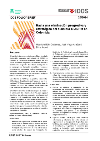 Esta síntesis de recomendaciones políticas aborda la eliminación progresiva del subsidio al ACPM en Colombia y subraya la necesidad urgente de una acción coordinada. El gobierno colombiano considera la eliminación progresiva del subsidio como parte de su estrategia de transición energética y propone inversiones en tecnologías carbono neutrales como sustitución. Sin embargo, el sector del transporte -principal consumidor de ACPM - se muestra escéptico sobre la viabilidad de estos planes.