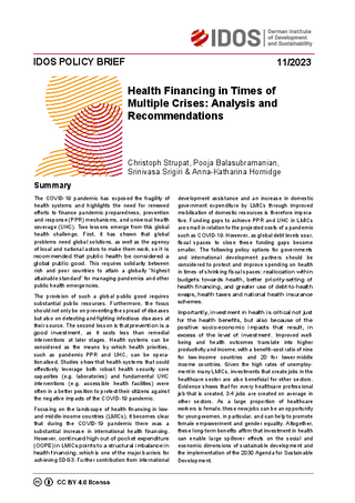 Focusing on the landscape of health financing in low- and middle-income countries (LMICs), it becomes clear that during the COVID-19 pandemic there was a substantial increase in international health financing. However, continued high out-of-pocket expenditure (OOPE) in LMICs points to a structural imbalance in health financing, which is one of the major barriers for achieving SDG3. Further contribution from international