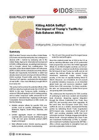 Given the relatively weak ties of SSA to the US as well as declining utilisation rates of US preferential trade programmes over time, the limited aggregate effects for all AGOA-eligible countries are not surprising. However, empirical results likely understate the full impact of new Trump-era tariffs and do not capture the indirect effects like reduced foreign investment, weakened supply chains, rising poverty, or the loss of capacity-building linked to AGOA. Moreover, our simulations do not account for potential retaliatory measures, so an intensified global trade war and economic downturn might further harm SSA economies. For these countries, the risks are compounded by limited fiscal space and growing debt vulnerabilities. This underscores the importance for SSA countries of continuing to build more resilient and diversified trade structures, deepening regional integration through the African Continental Free Trade Area (AfCFTA), and pursuing value chain upgrading. At the same time, the European Union (EU) must reaffirm its role as a reliable, development-friendly partner by defending World Trade Organisation (WTO)-based rules, renewing its GSP ahead of 2027, and avoiding retaliatory tariffs that harm vulnerable countries. Strategic engagement with the Global South – through initiatives like Clean Trade and Investment Partnerships (CTIPs) or Sustain-able Investment Facilitation Agreements (SIFAs) – offers a timely opportunity to strengthen trust and promote sustainable, inclusive trade.