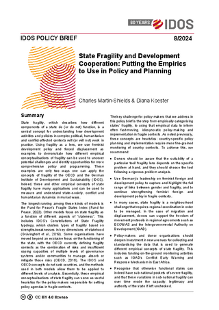 State fragility, which describes how different components of a state do (or do not) function, is a central concept for understanding how development activities and policies in complex political, humanitarian and conflict-affected contexts will (or will not) work in practice. Using fragility as a lens, we use feminist development policy and forced displacement as examples to demonstrate how different empirical conceptualisations of fragility can be used to uncover potential challenges and identify opportunities for more comprehensive policy and programming. These examples are only two ways one can apply the concepts of fragility of the OECD and the German Institute of Development and Sustainability (IDOS). Indeed, these and other empirical concepts of state fragility have many applications and can be used to measure and understand state–society, conflict and humanitarian dynamics in myriad ways.