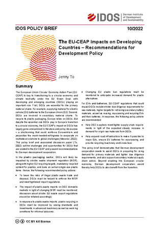 The European Union Circular Economy Action Plan (EU-CEAP) is key to transitioning to a circular economy and climate neutrality under the EU Green Deal, with developing and emerging countries (DECs) playing an important role. First, DECs are essential for the primary material chains, for example, supplying material for electric vehicle (EV) batteries to the European Union (EU). Second, DECs are involved in secondary material chains: To recycle its plastic packaging, Europe relies on DECs. But despite the essential role DECs play in Europe’s transition to a circular economy, the EU-CEAP’s impact on DECs has largely gone unexamined in literature and policy discourses – a shortcoming that could reinforce Eurocentrism and jeopardise the much-needed willingness to cooperate on multilateral solutions to global challenges (Messner, 2022). This policy brief and associated discussion paper (To, 2022) outline challenges and opportunities for DECs that are related to the EU-CEAP and present recommendations for German development cooperation. In the plastic packaging sector, DECs will likely be impacted by stricter waste shipment regulation (WSR), along with higher EU recycling targets, mandatory recycled content for plastics, and bans on certain single-use plastic items. Hence, the following recommended policy actions: