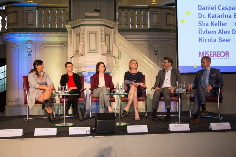 Wie kann sich die EU in Zeiten eines erstarkenden Populismus, anhaltender humanitärer Krisen und eines rasanten Klimawandels aufstellen? Das war die zentrale Frage bei der Podiumsdiskussion von Misereor, Brot für die Welt und SDSN Germany am 9. April mit den EU-Spitzenkandidat*innen von SPD, CDU/CSU, Bündnis 90/Die Grünen, FDP und Die Linke. Welche Rolle nimmt die EU als Friedensmacht, als Akteur sozialer Gerechtigkeit und bei der Umsetzung der Agenda 2030 ein? Dazu diskutierten Katarina Barley (SPD), Daniel Caspary (CDU/CSU), Ska Keller (Bündnis 90/Die Grünen), Till Mansmann (FDP) und Özlem Demirel (Die Linke). In ihrer Einleitung in den dritten Themenblock des Abends stellte Dr. Christine Hackenesch (DIE) die Rolle der EU für die Umsetzung nachhaltiger Entwicklung und einer sozial-ökologischen Transformation heraus. Die Debatte war geprägt von der gemeinsamen Überzeugung für das europäische Projekt, aber auch von stark divergierenden Ansichten über den Umgang mit seinen Herausforderungen. Zum Abschluss der Diskussion wurde von den Organisatoren hervorgehoben, dass die diskutierten Herausforderungen nicht nur für Europa relevant seien. Der globale Einfluss der EU und ihre Strategie für nachhaltige Entwicklung üben einen starken Einfluss über ihre Grenzen hinaus aus. Wer bei der Europawahl wählt, wählt in diesem Sinne auch für die Weltgemeinschaft.